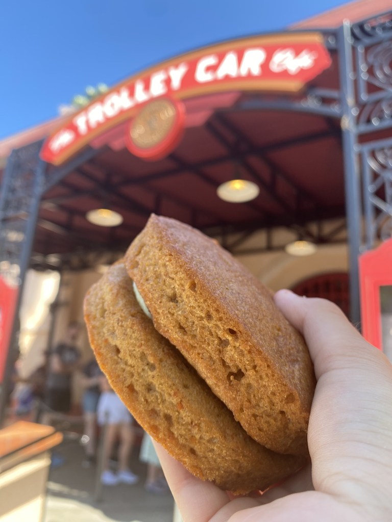 My take on this sweet goes hand-in-hand with my previous one: it needs more frosting, even more than the Wookiee Cookie does as you can tell from the picture. Stationed at the Trolley Car Café, this is a skip if you are not enthusiastic about carrot cake or long lines, as this is also the home of Hollywood Studios’ Starbucks. No matter the time of day, the coffee-lovers are packing in to get a much-needed energy boost. I’ll brave the chaos every once in a while to find hidden merch and snacks like this one. Once you get your hands on it, eat it right away before the Florida heat makes it soft and sticky to enjoy that ideal carrot cake consistency. The frosting is tasty, I just think there needs to be more of it for a better cake-to-frosting ratio.