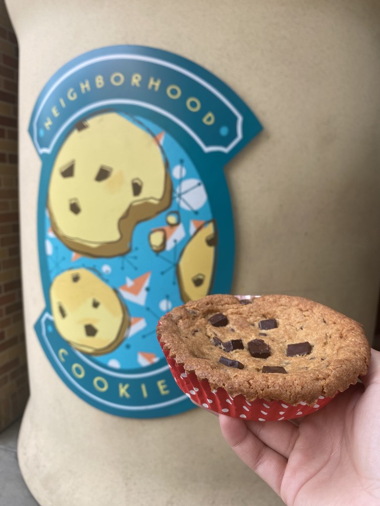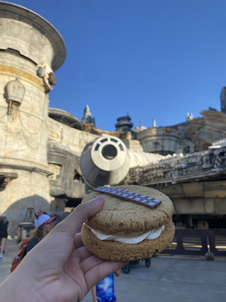 Surprisingly, this cookie is not available in Galaxy’s Edge (I walked to the Millennium Falcon for the perfect picture). It is served at the Backlot Express, located right next to Star Tours. As a super popular choice of dessert in the park, my ranking of it comes down to personal preference. Oatmeal cookies are definitely necessary for the Chewbacca aesthetic, I just find them a bit plain. The milk chocolate sash on top is adorable and a nice touch, but my biggest complaint is the lack of frosting. I understand that since you are eating it as a sandwich you don’t want to have frosting flying everywhere when you squish the cookies together to take a bite, yet it would really enhance the flavor and dessert as a whole for me.