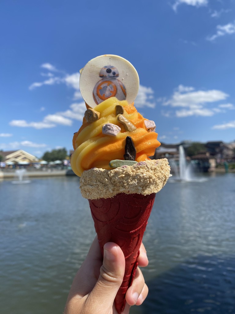 The other awesome feature of Swirls on the Water is its theming of the desserts. Not only are there specialties for the holidays like the Easter Basket Nachos, there are also treats corresponding to Disney events. I got this BB-8 cone at the beginning of May in accordance with May 4, a huge deal in Disney World. The red velvet cone held mango Dole Whip and habanero ice cream with chocolate rocks, toasted graham cracker crumbs, and a white chocolate BB-8 to top it all off. It was by far the most interesting flavor combination I’ve had . . . I never thought I’d use the word “spicy” to describe ice cream.